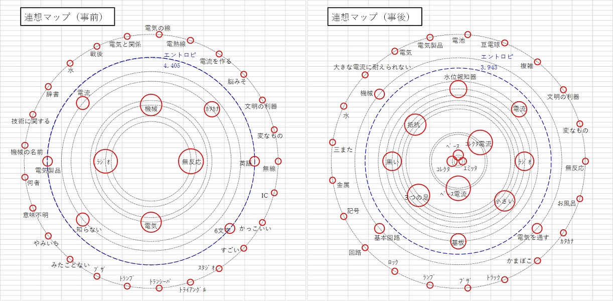 ・エントロピが 4.405 → 3.943 と小さくなっており,「トランジスタ」に対する集団の連想が一定の語に収束したことが読み取れる。このことは,「トランジスタ」の語に対する連想が,授業前には広範囲に広がっていた(捉えどころが無く,バラバラな連想を抱かせていた)状態から授業後には関連する語に収束した(集団が同じような連想をするに至った)状態になったことを意味すると考えられる。